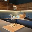 Lo spazio della cucina è pensato per essere agevole e pratico, senza rinunciare all'estetica elegante che la caratterizza. Completamente attrezzata, con ampio frigorifero, forno, bollitore, nespresso e piastre a induzione.