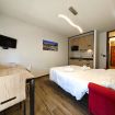 Il soggiorno con cucina attrezzata ospita un comodo divano letto e la piccola cameretta ha un confortevole letto a castello, il bagno è con doccia e bidet.