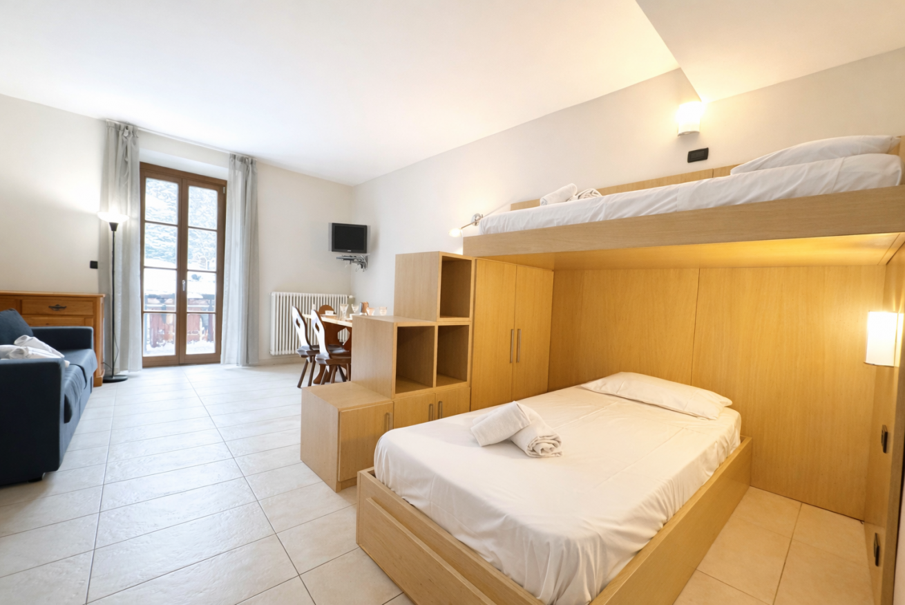 Benvenuti nel nostro accogliente monolocale a Pragelato! Ideale per una vacanza in montagna, l'alloggio è dotato di un comodo letto a castello e di un divano letto, perfetto per ospitare fino a quattro persone.