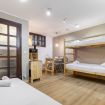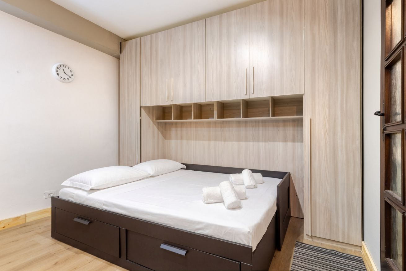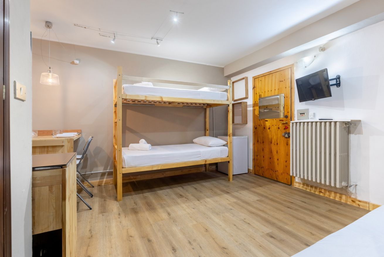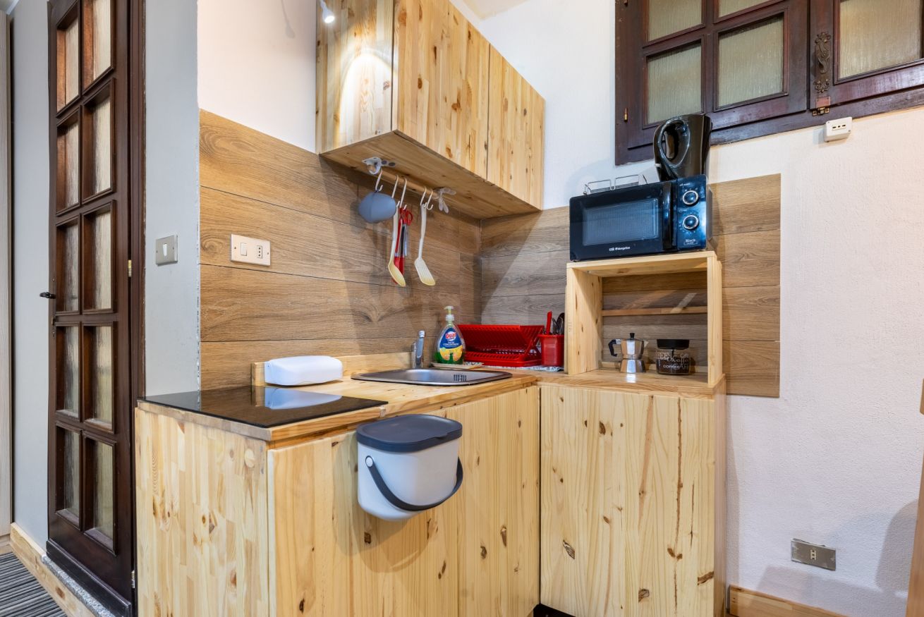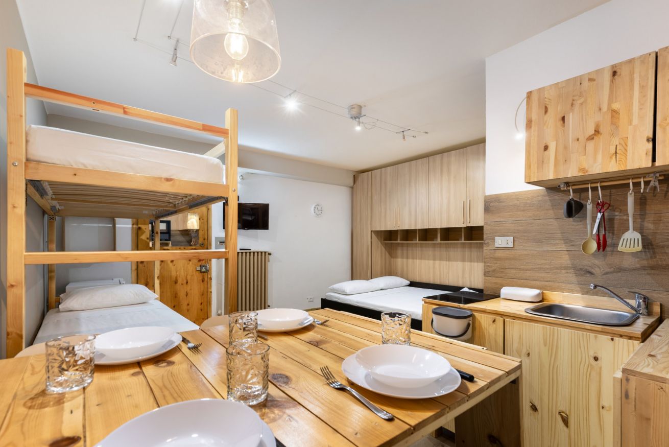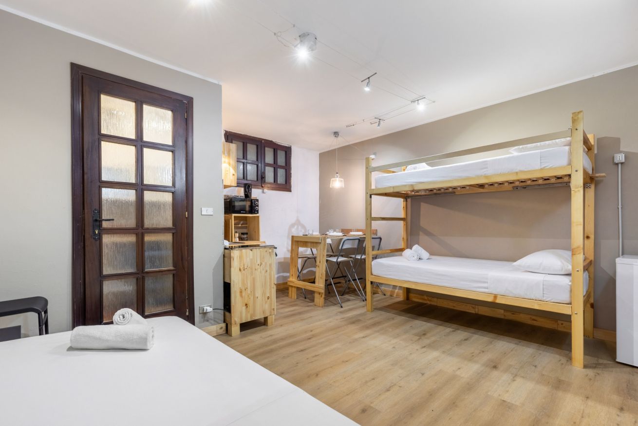 Accogliente monolocale ideale per coppie, famiglie o piccoli gruppi. L’ambiente è curato e funzionale, con letto matrimoniale e letto a castello, arredi in legno e spazi ben organizzati.