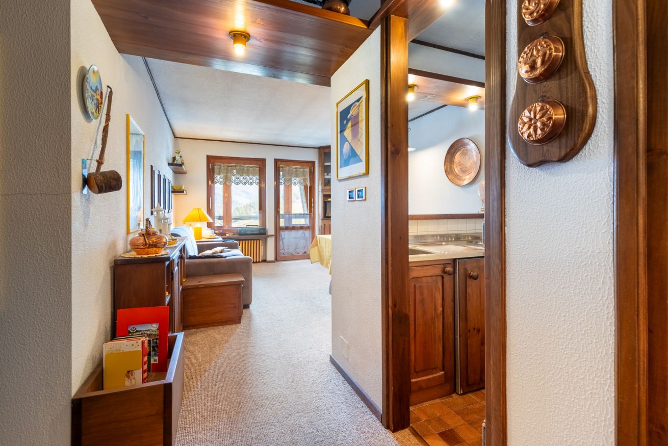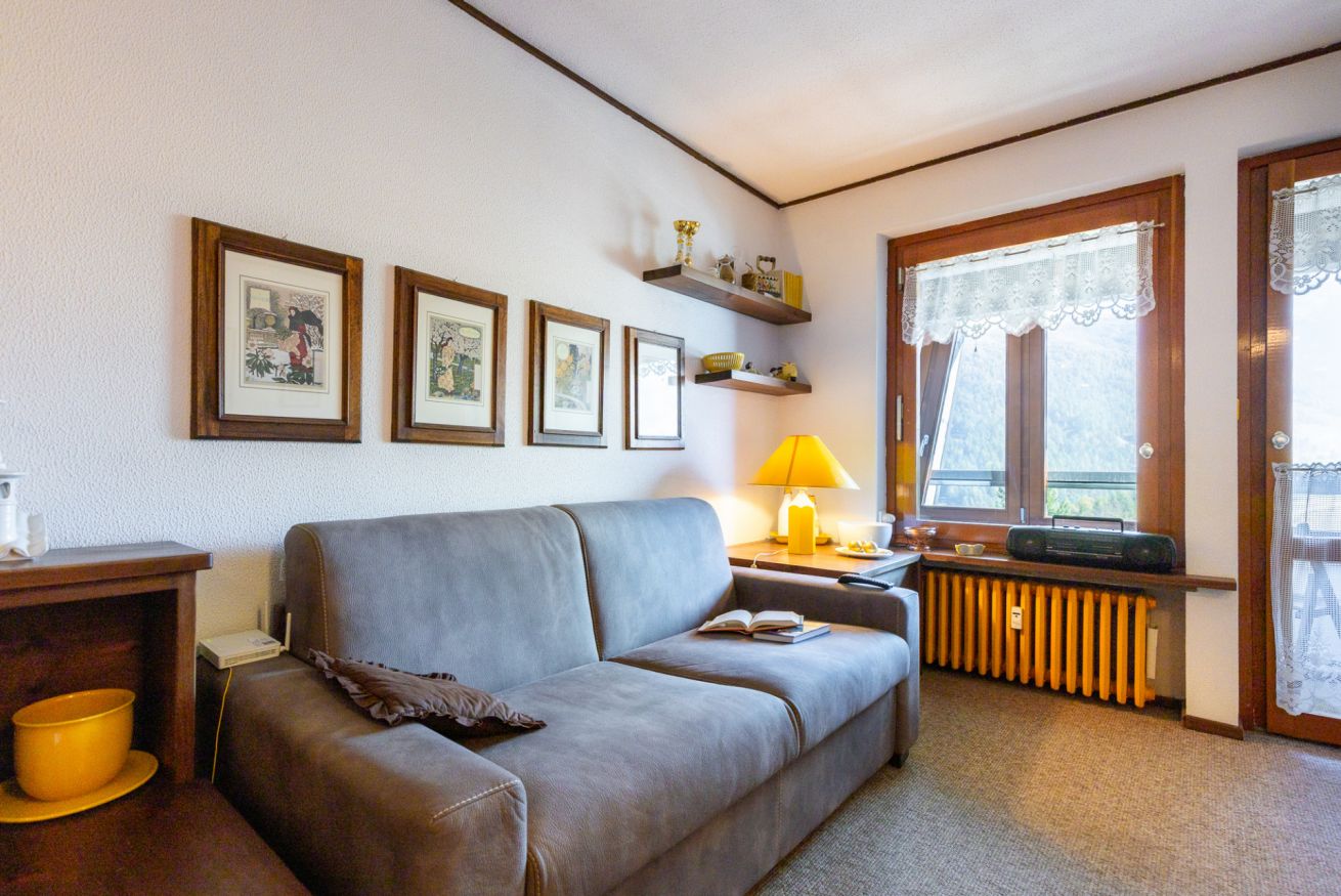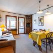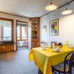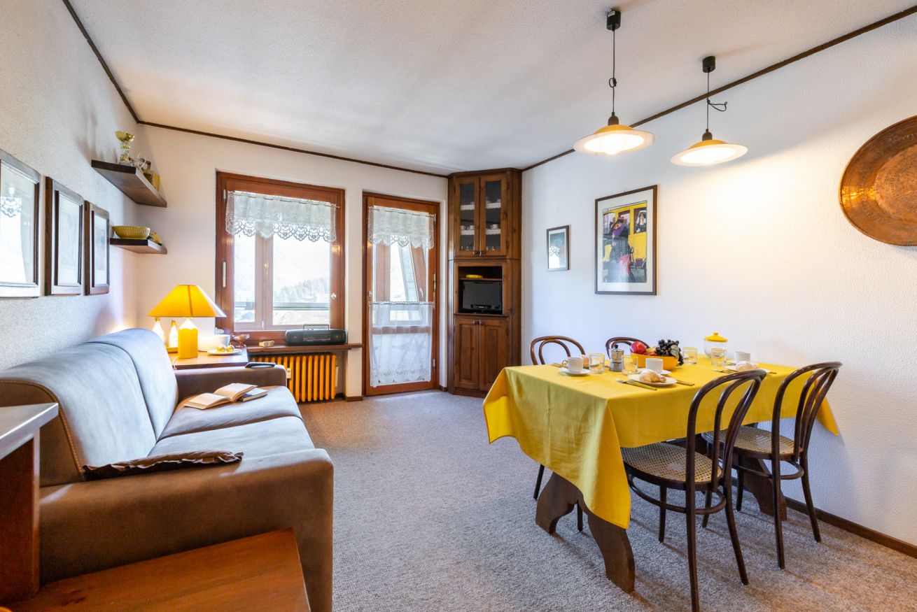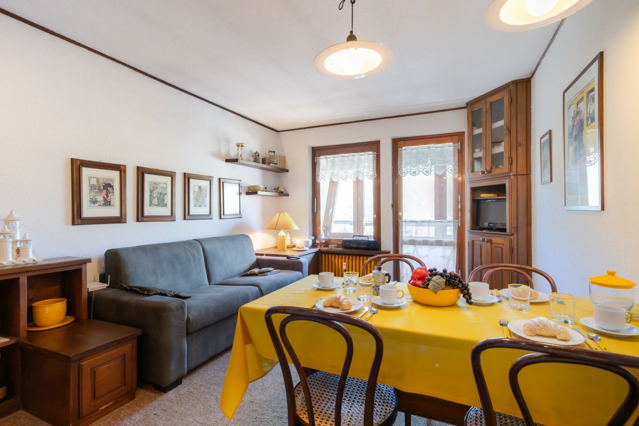 Dispone di un soggiorno con comodo divano letto matrimoniale, perfetto per riposarsi dopo una giornata sulla neve e di una camera con un letto a castello. Il balcone verandato regala una splendida vista panoramica sulle montagne, ideale per rilassarsi in ogni stagione.