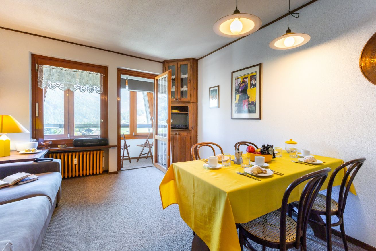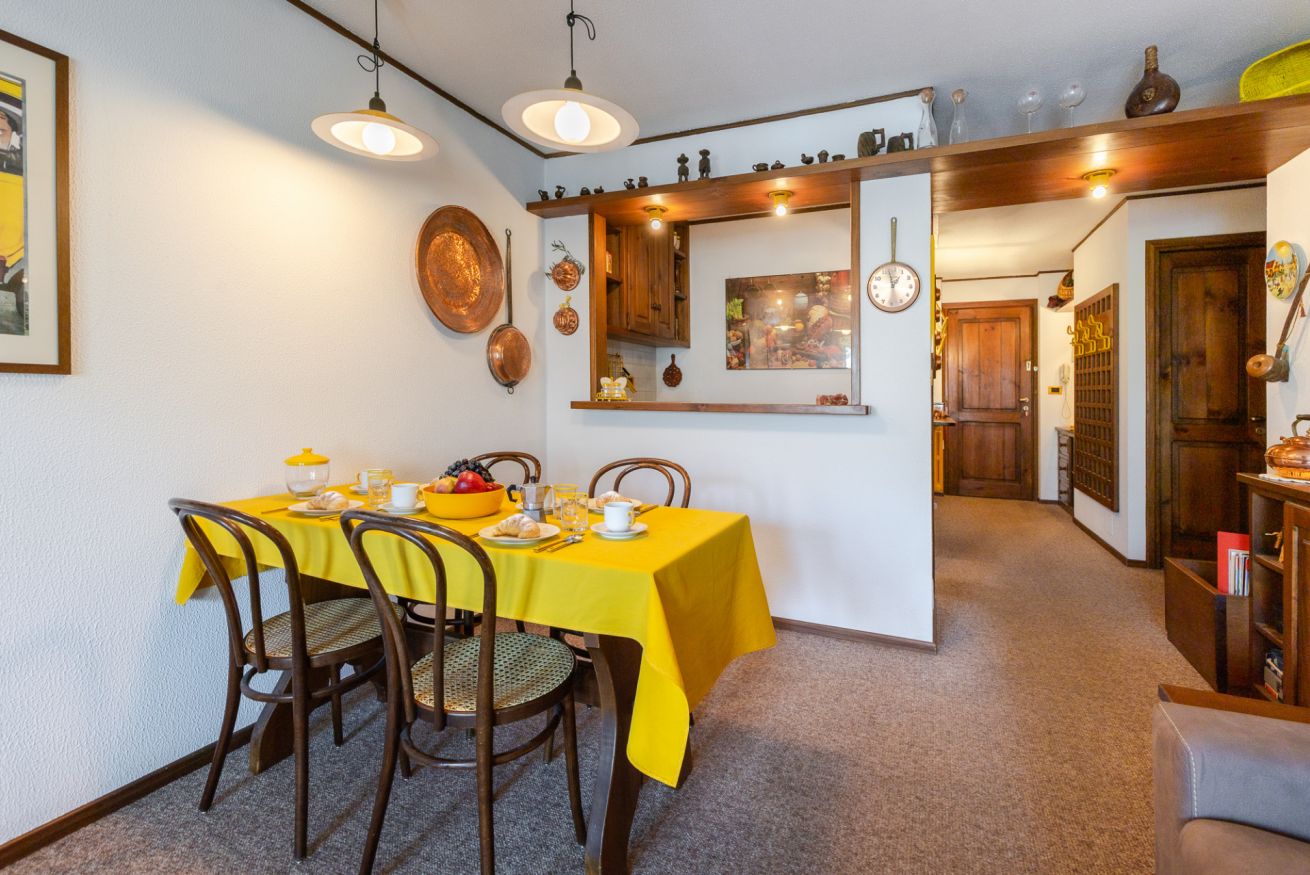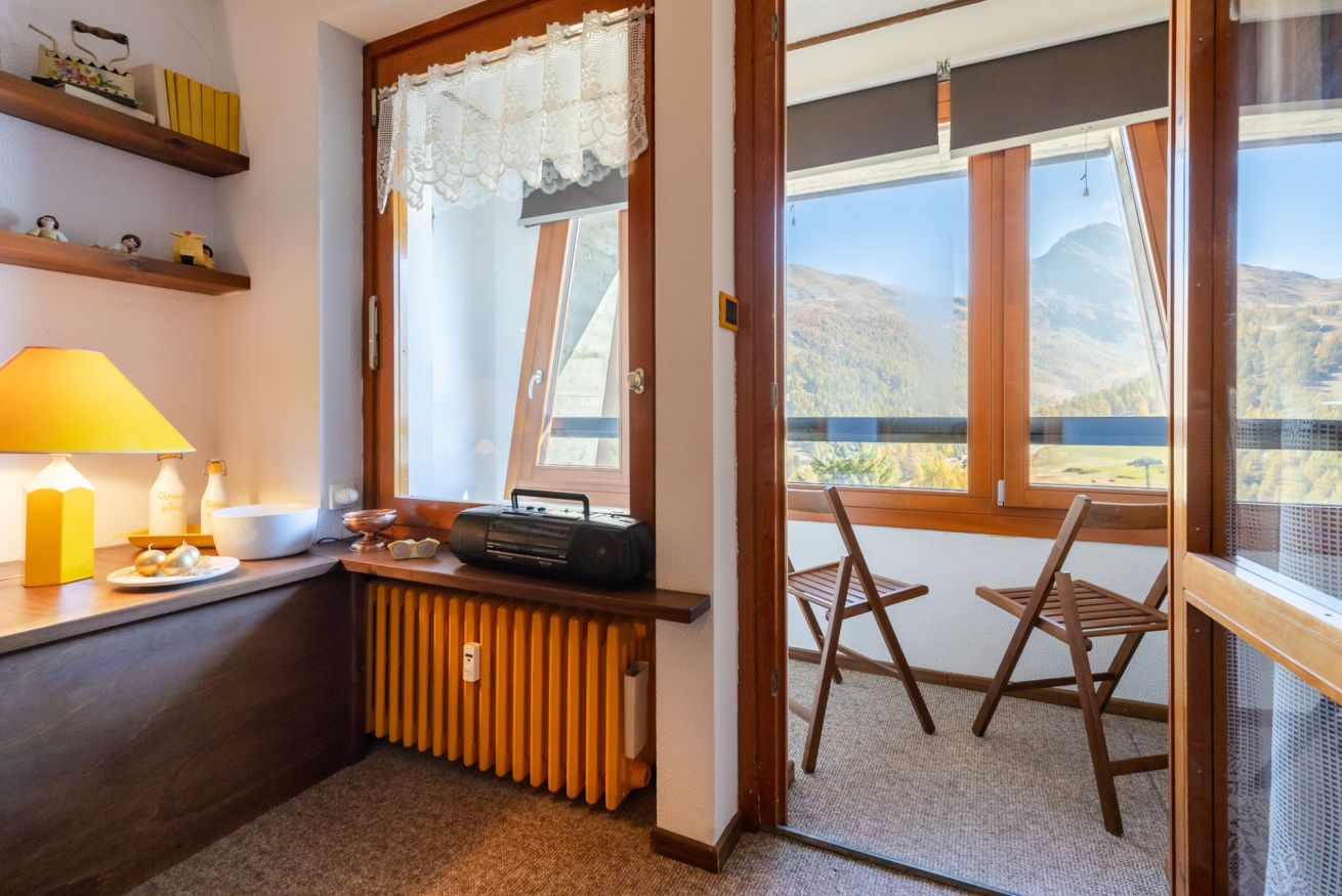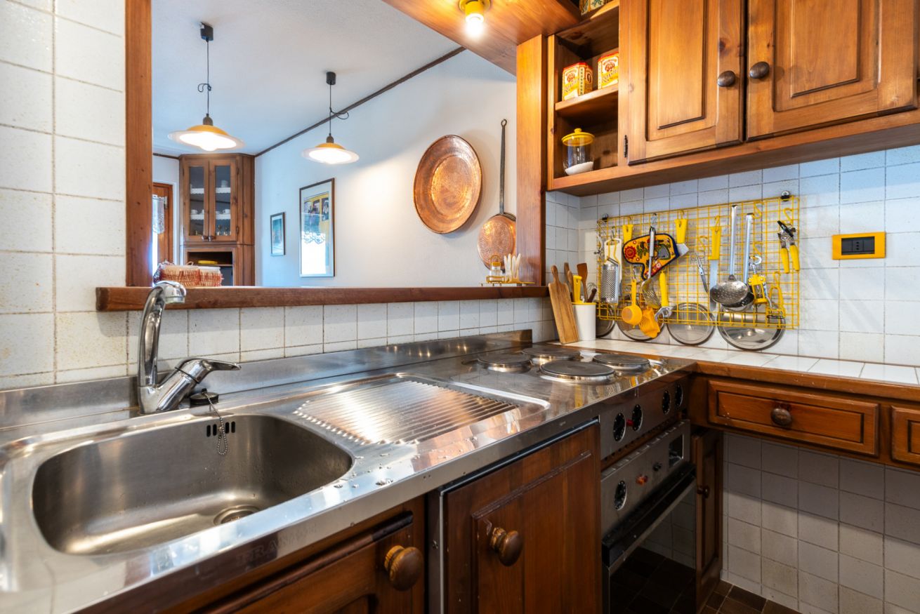 Dispone di un soggiorno con comodo divano letto matrimoniale, perfetto per riposarsi dopo una giornata sulla neve e di una camera con un letto a castello. Il balcone verandato regala una splendida vista panoramica sulle montagne, ideale per rilassarsi in ogni stagione.