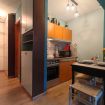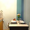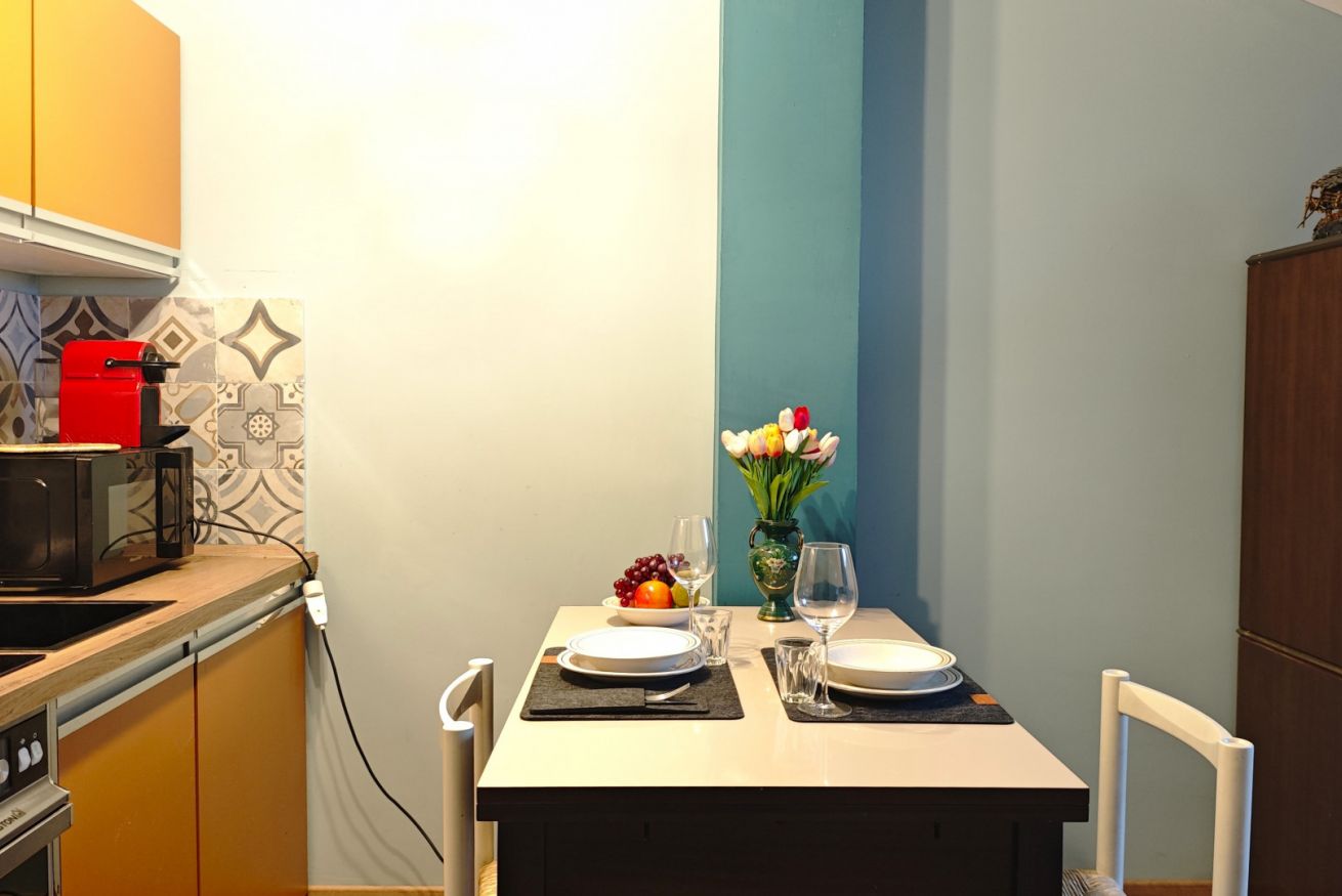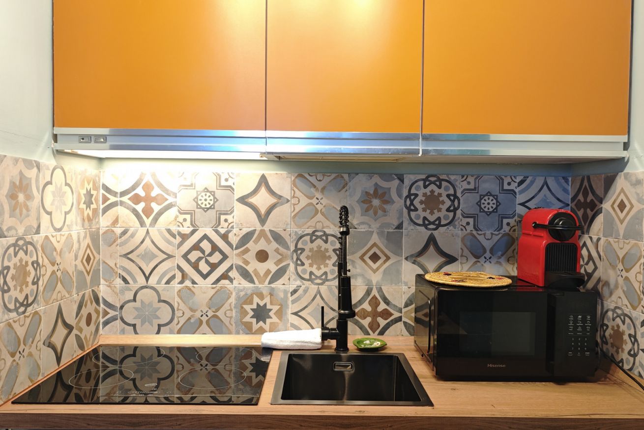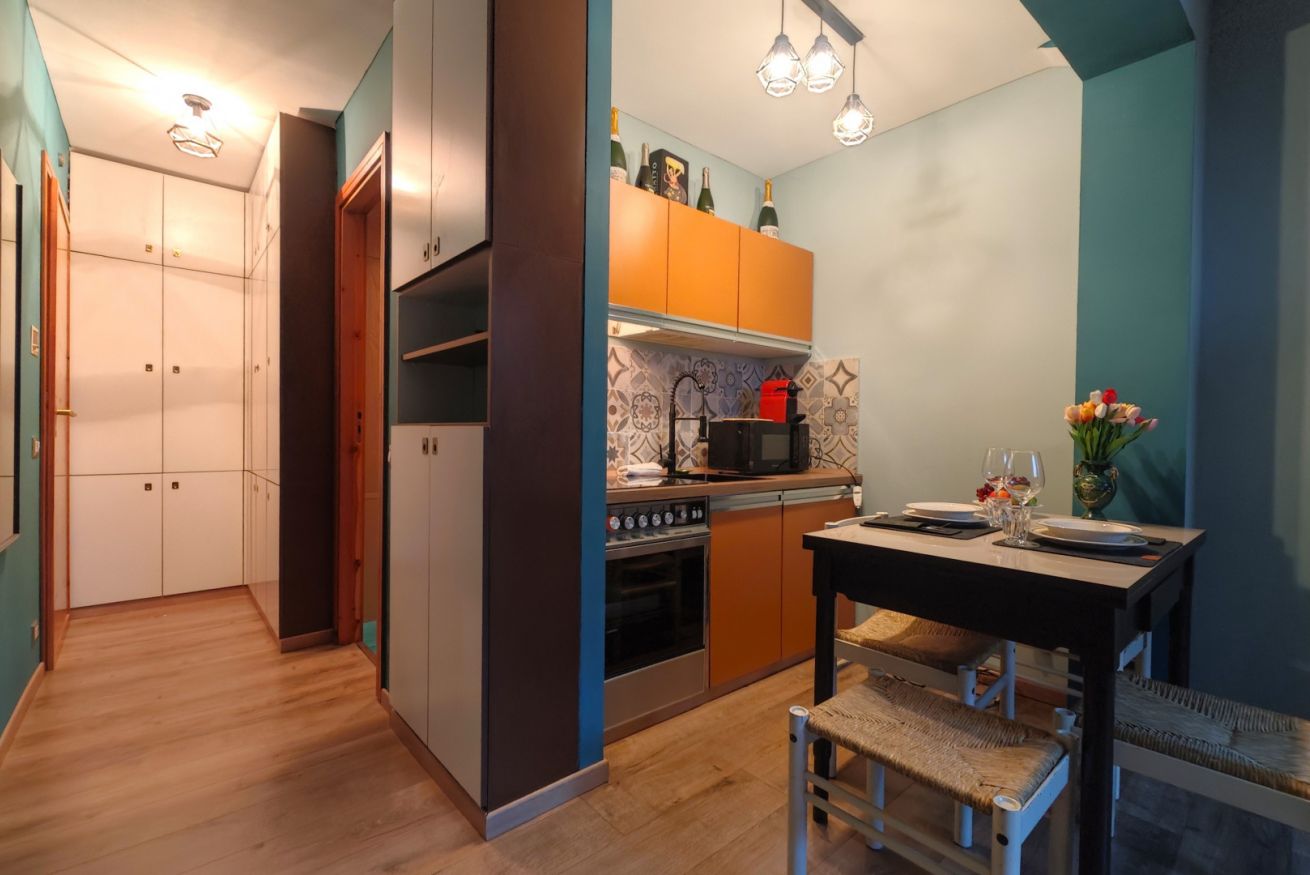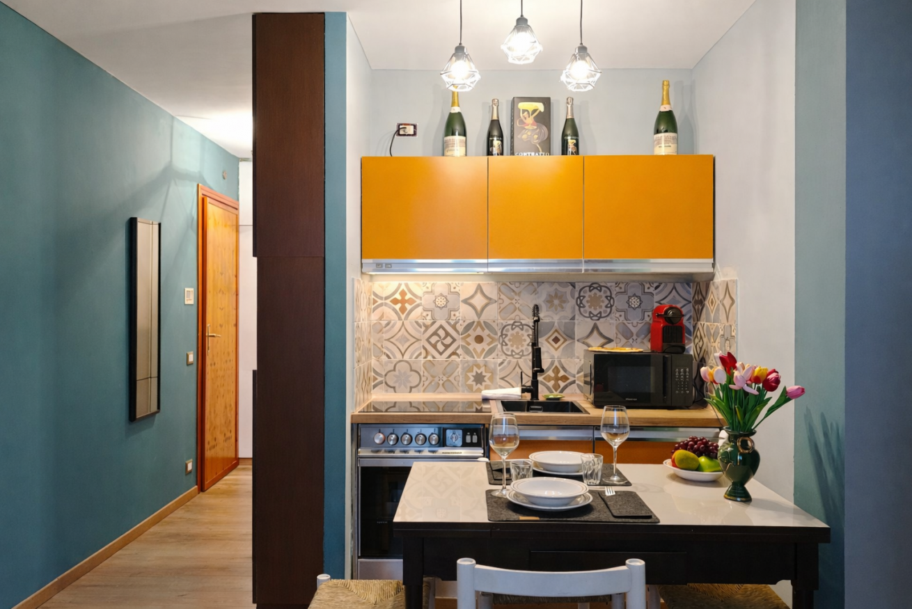 Il monolocale presenta un ambiente curato nei dettagli, con pareti azzurre che donano un’atmosfera rilassante e moderna. La cucina è dotata di forno, microonde, piastra a induzione e macchina del caffè Nespresso, ideale per preparare pasti e colazioni in autonomia.