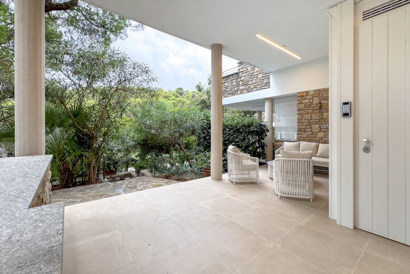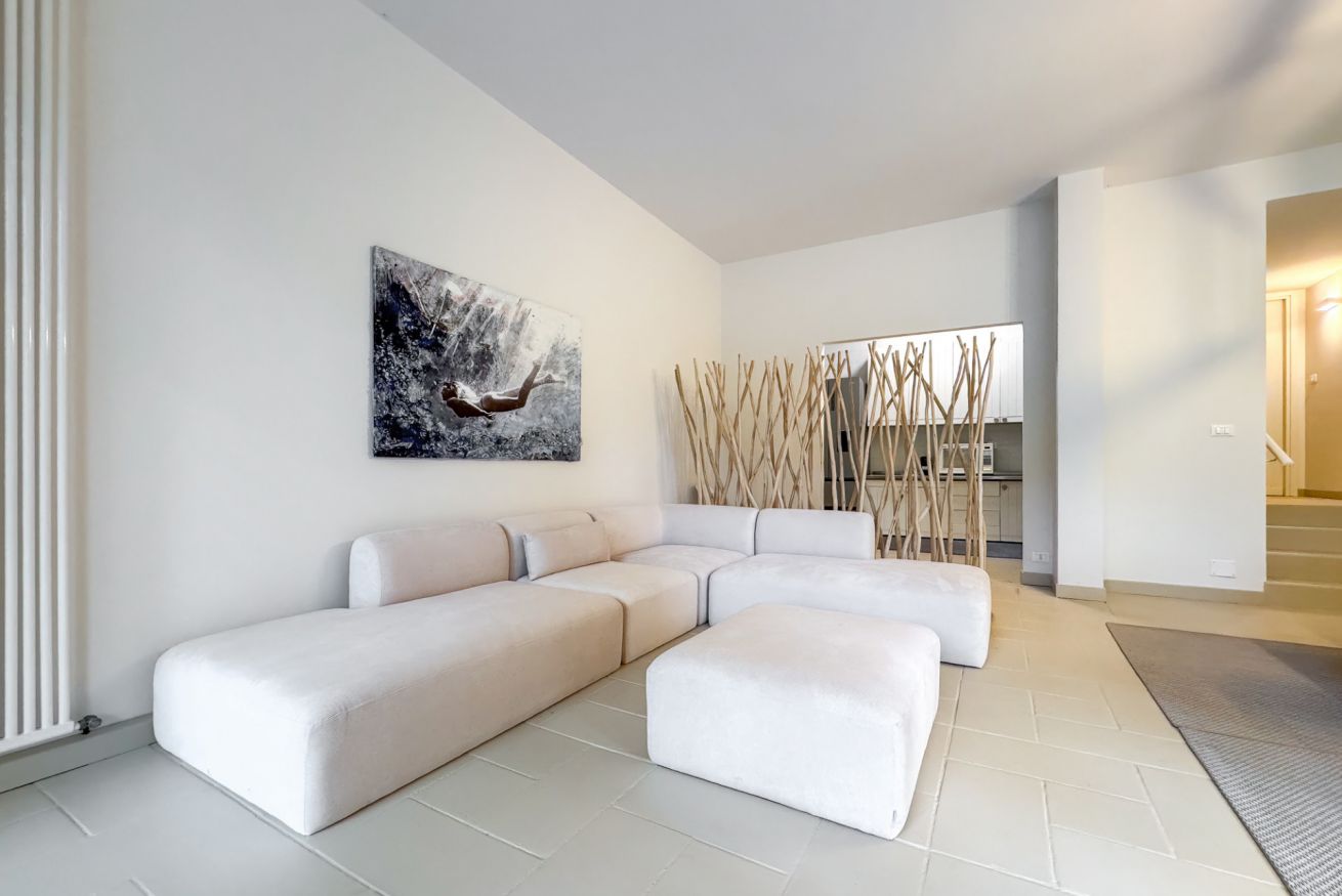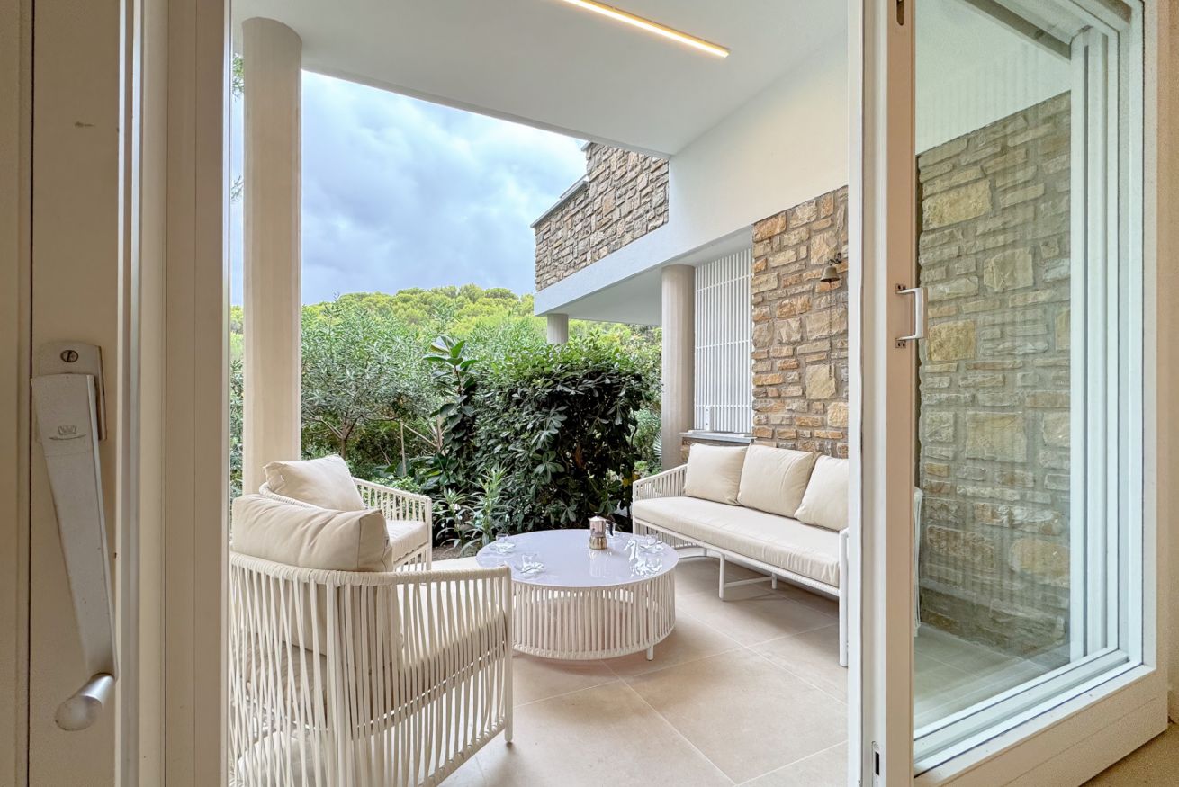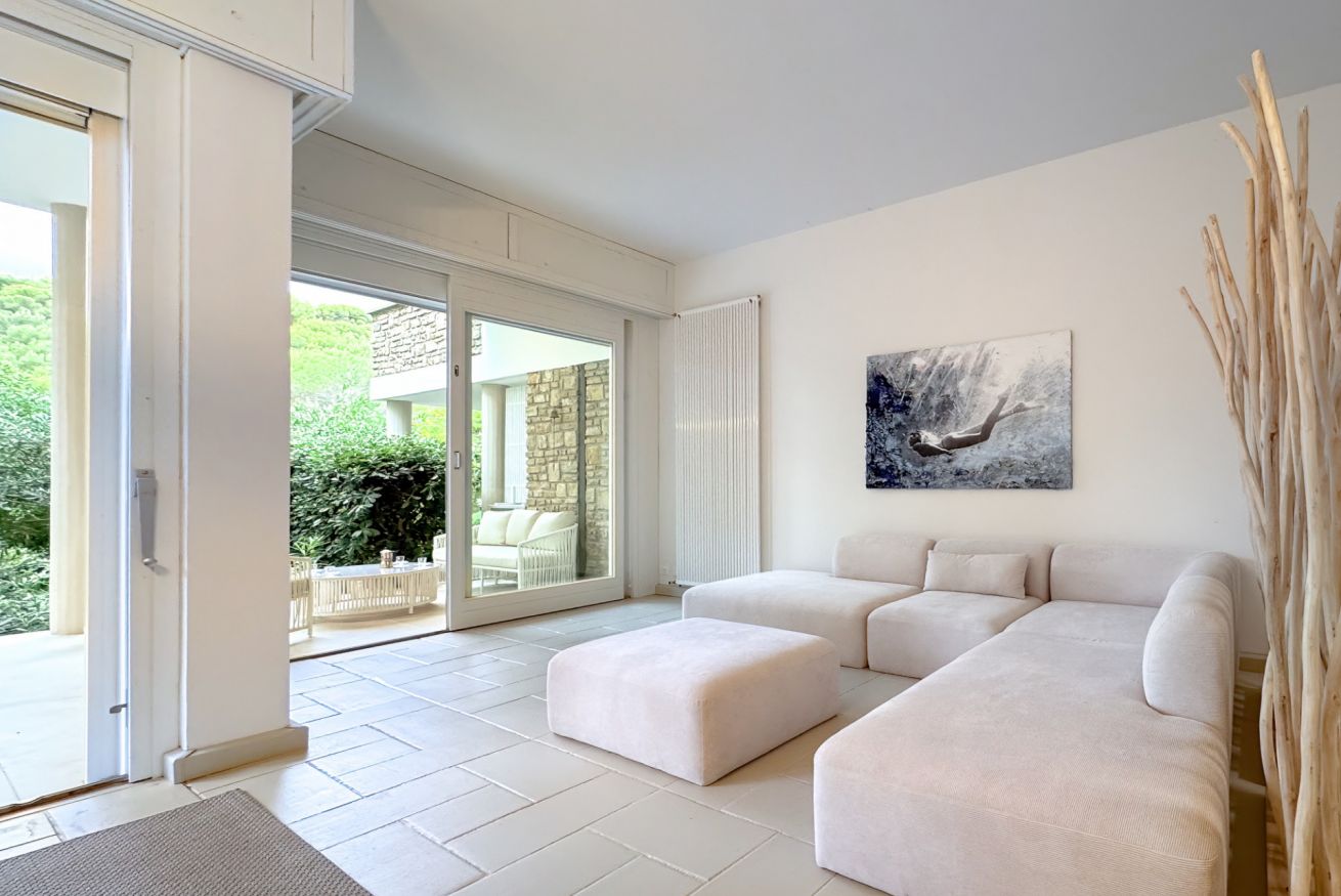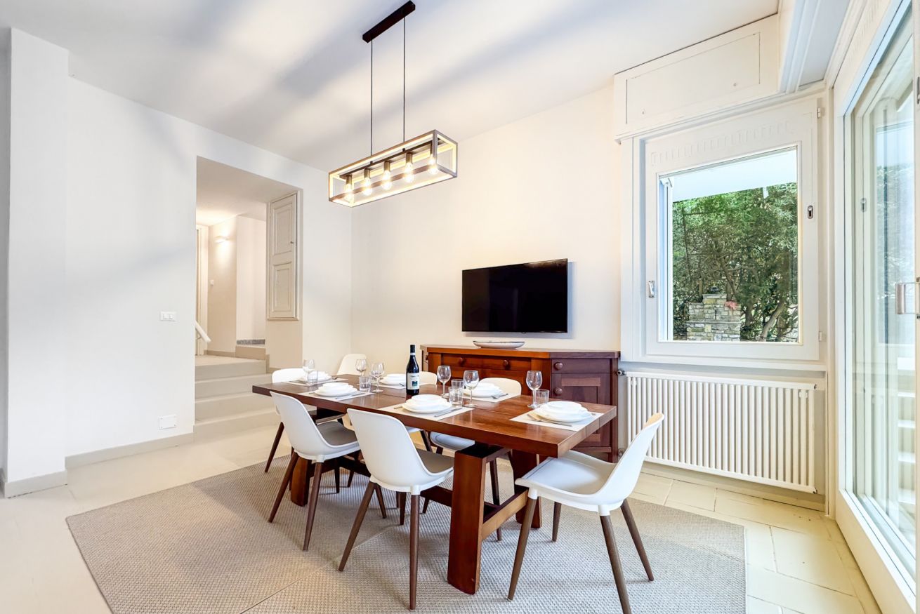 Luminoso e confortevole, offre un grande salone con vista sul verde e un ampio patio soleggiato ideale per relax e cene all’aperto.