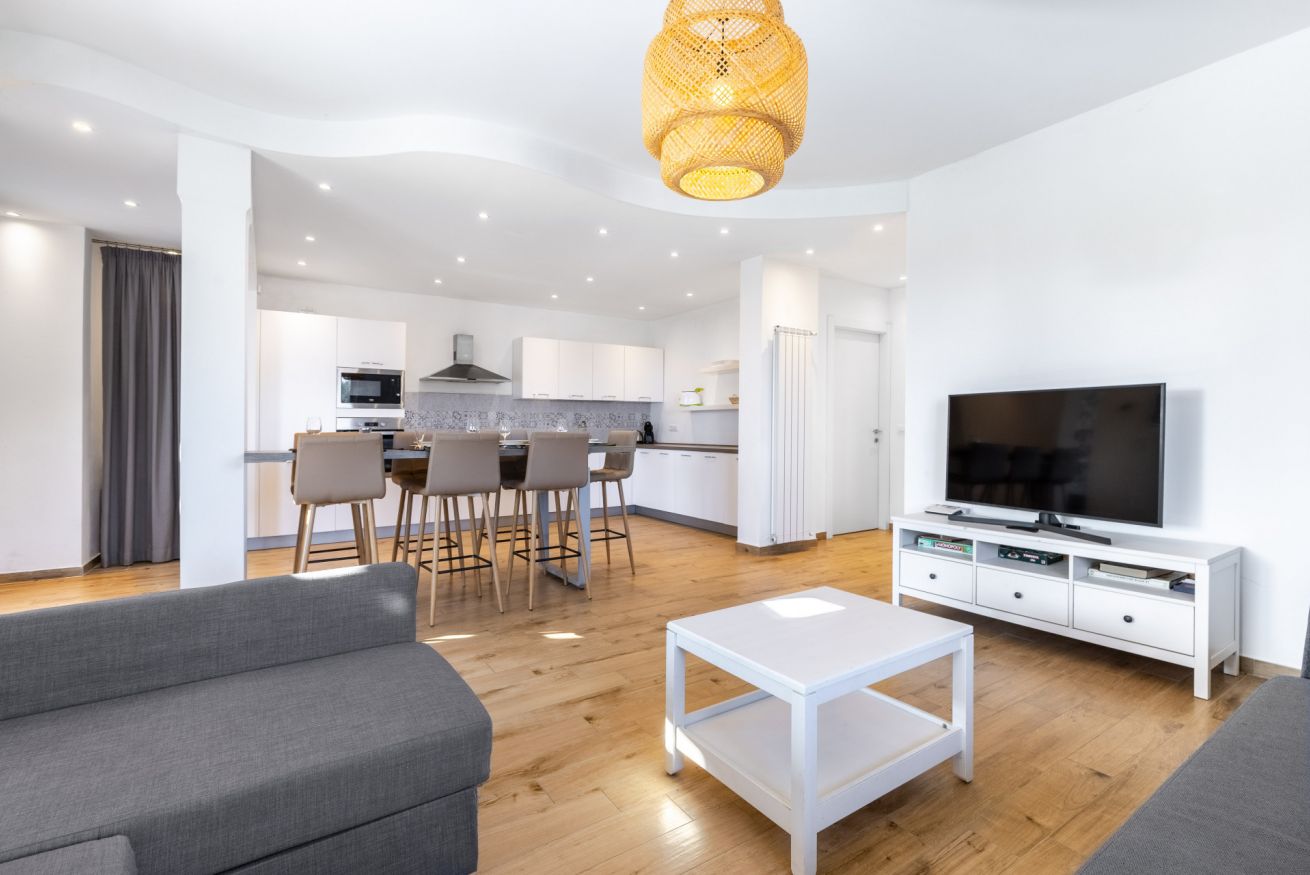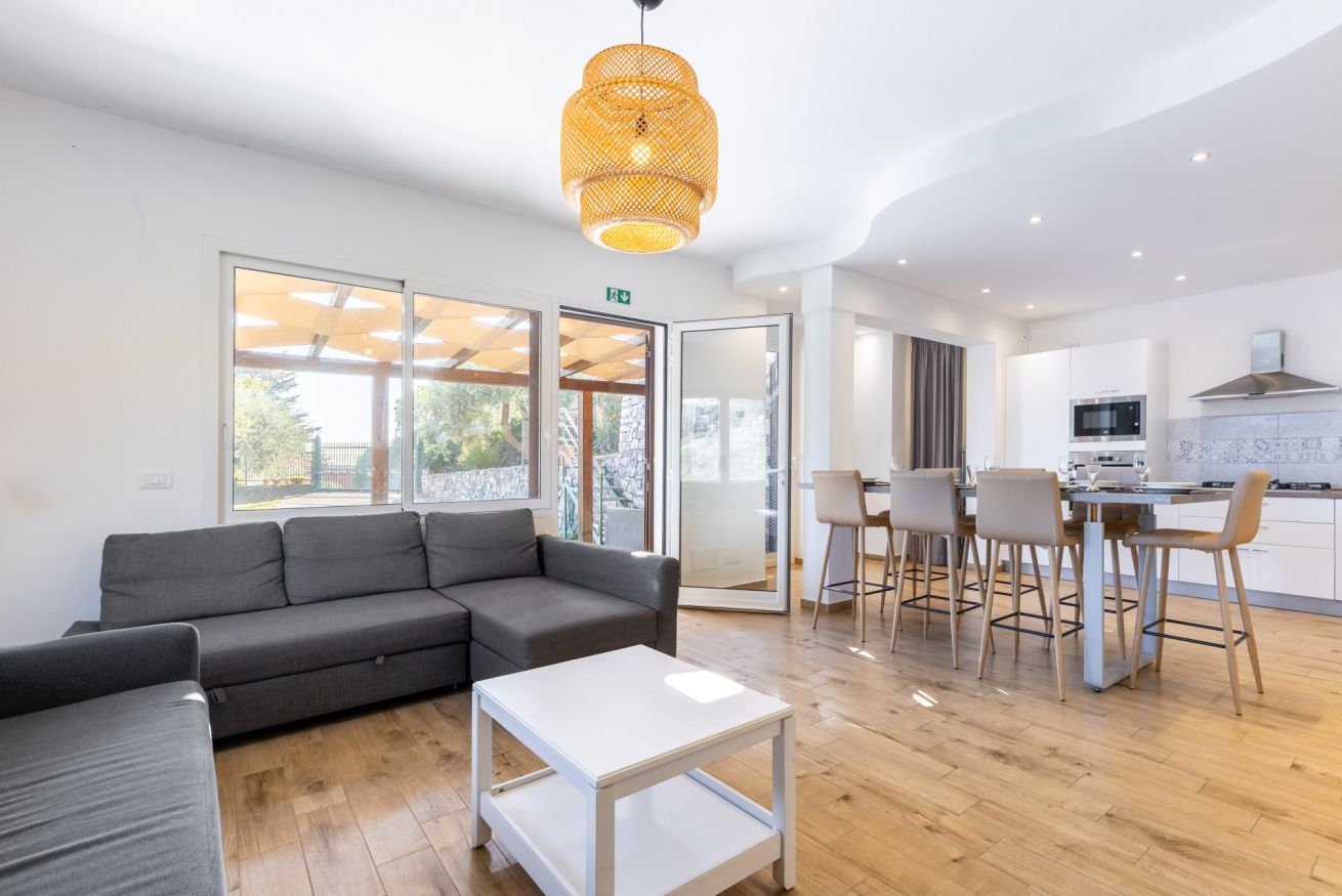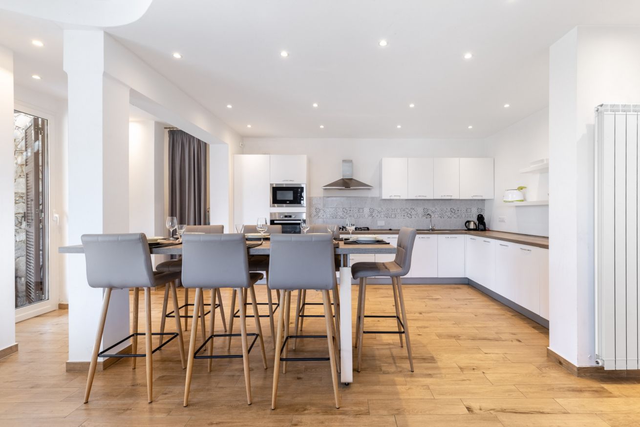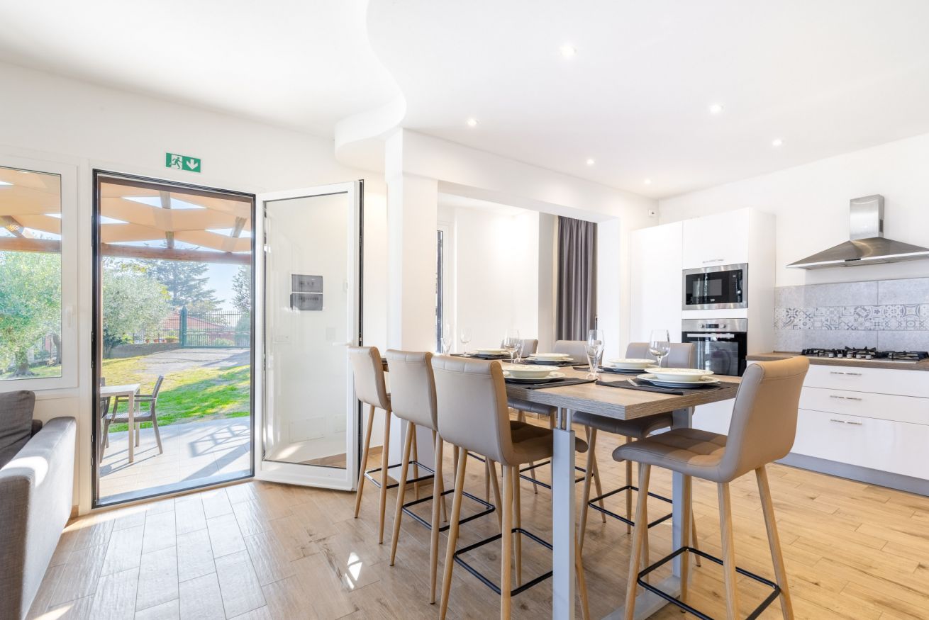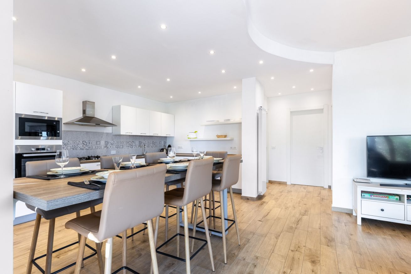 L’ingresso si apre su un ampio open space che unisce soggiorno e cucina, impreziosito da un elegante tavolo all’americana, perfetto per convivialità e momenti di relax.