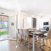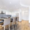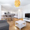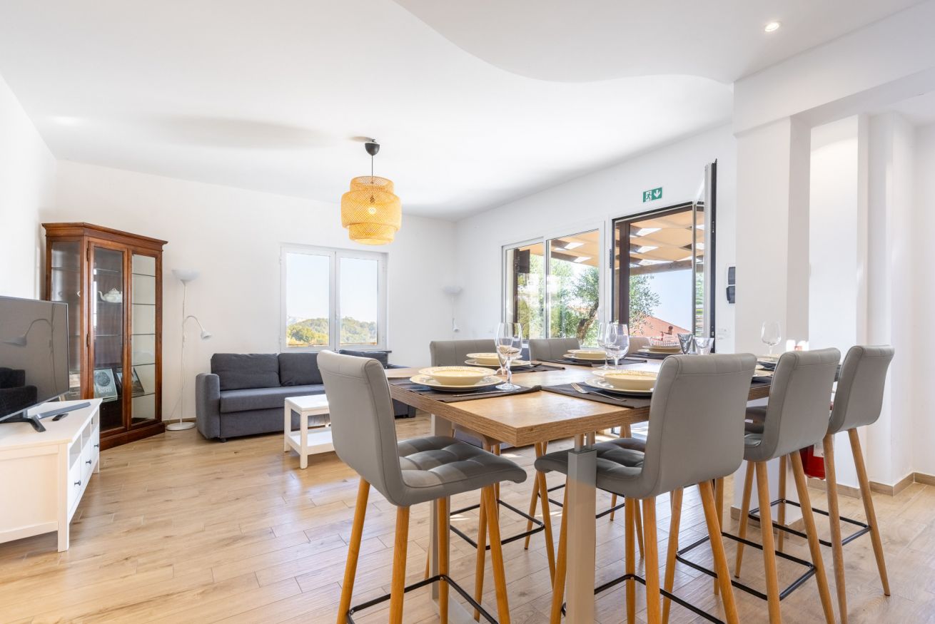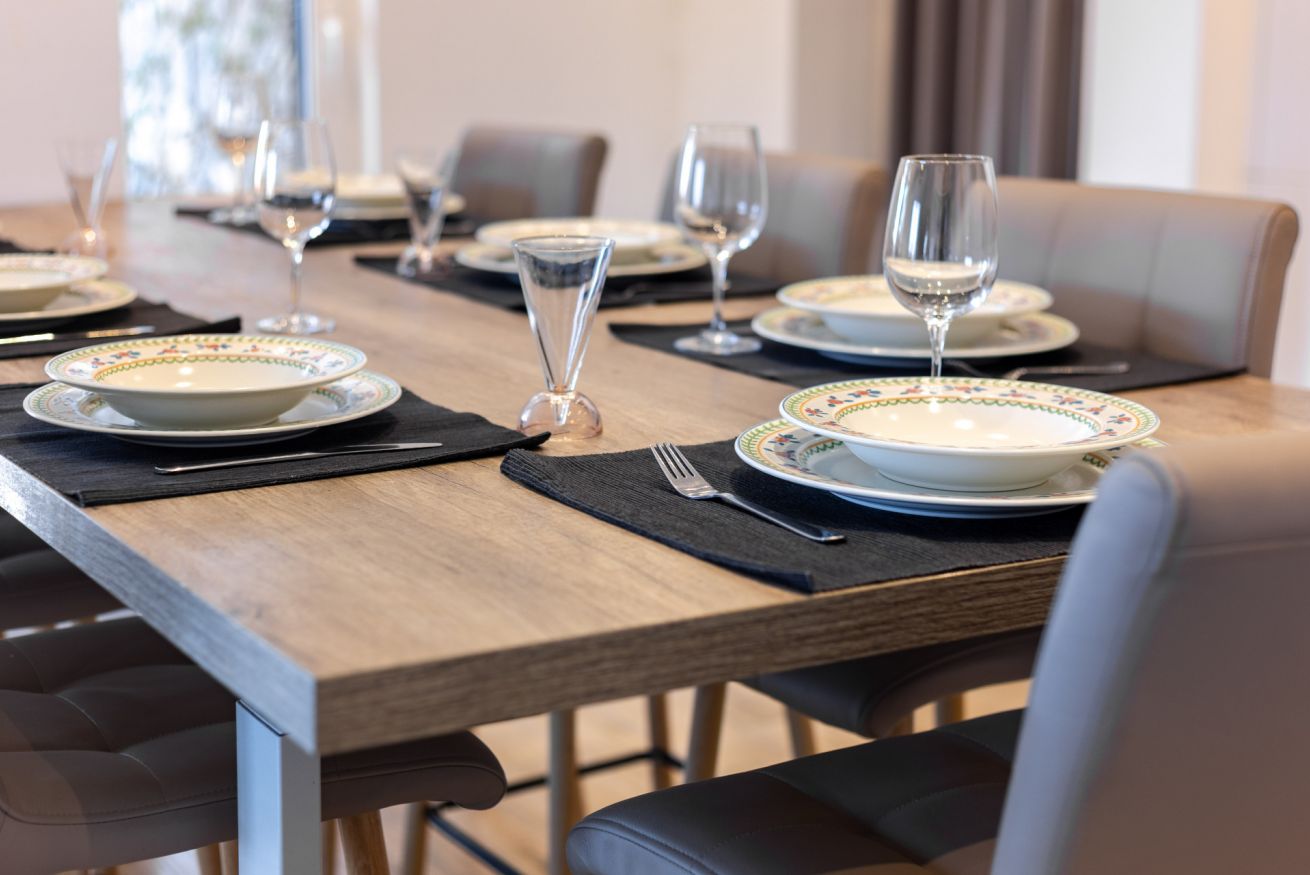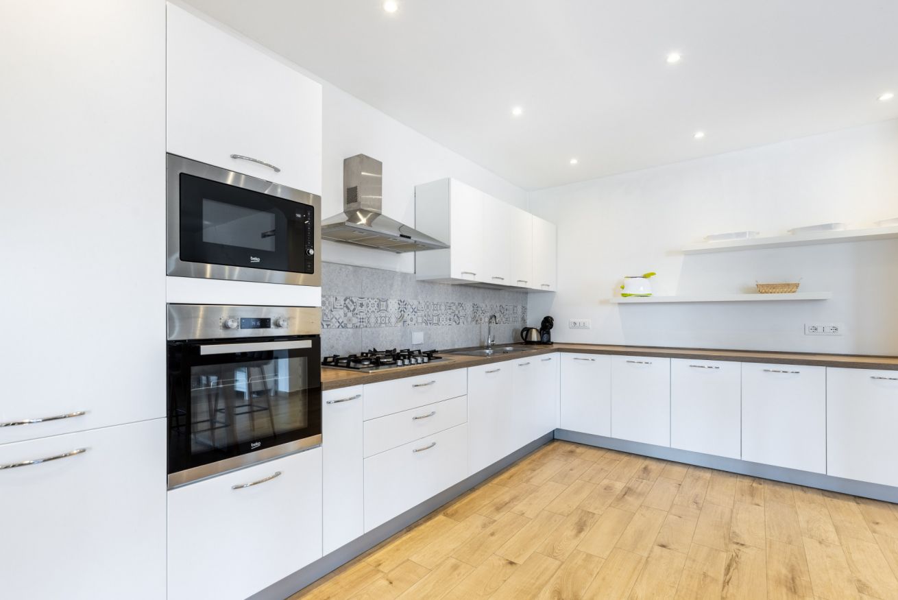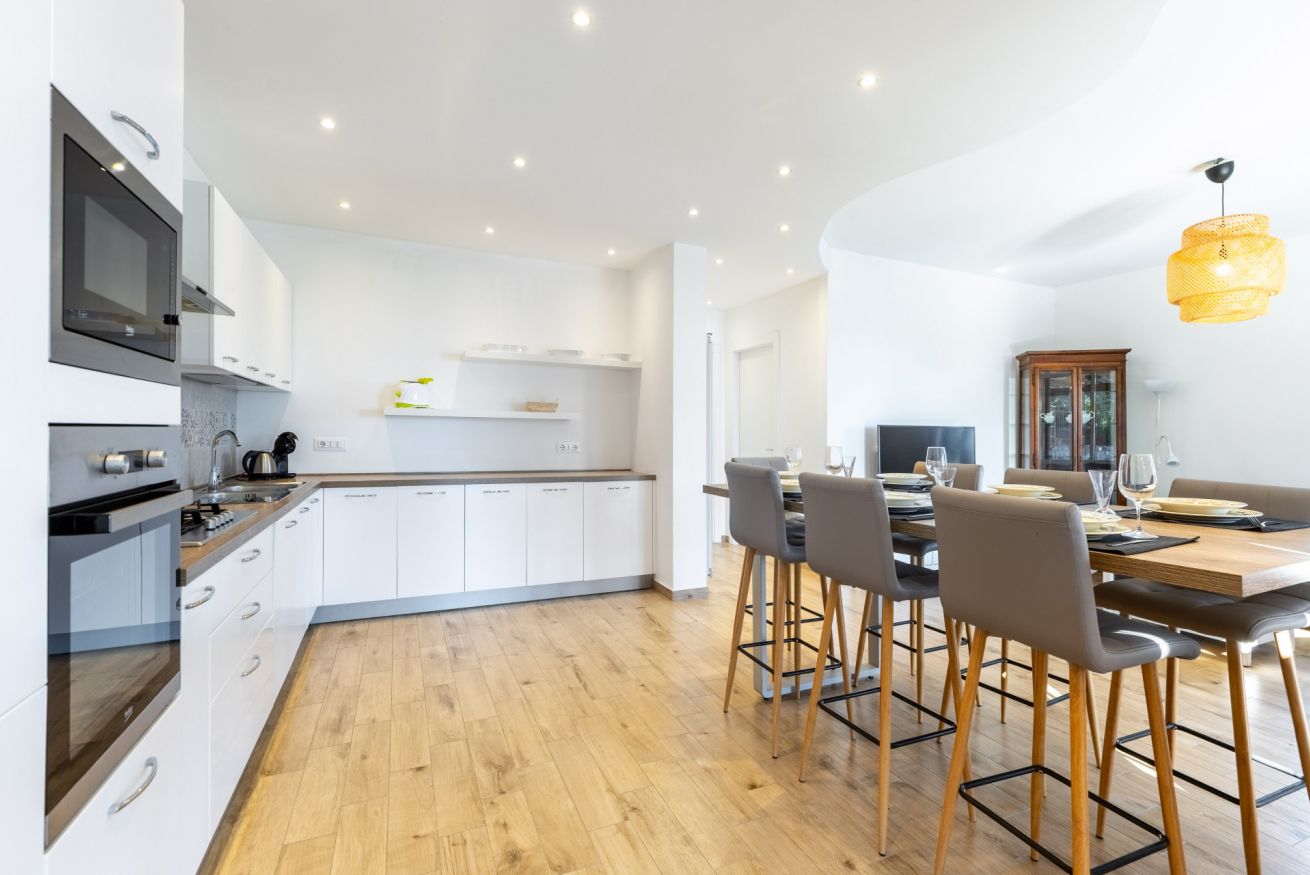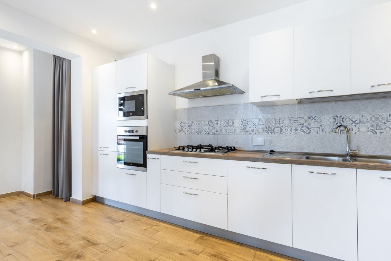 L’ingresso si apre su un ampio open space che unisce soggiorno e cucina, impreziosito da un elegante tavolo all’americana, perfetto per convivialità e momenti di relax.