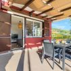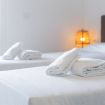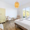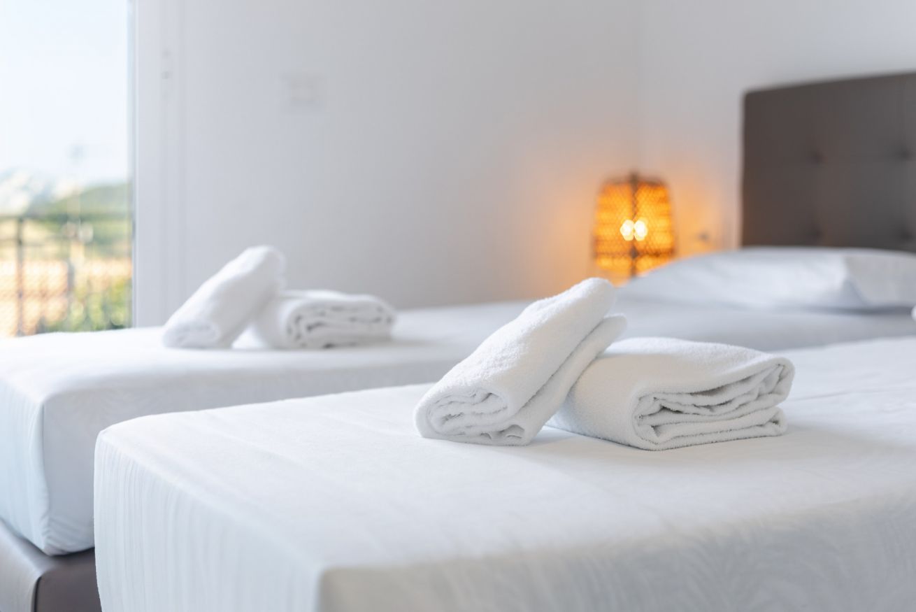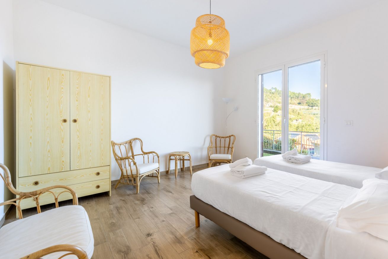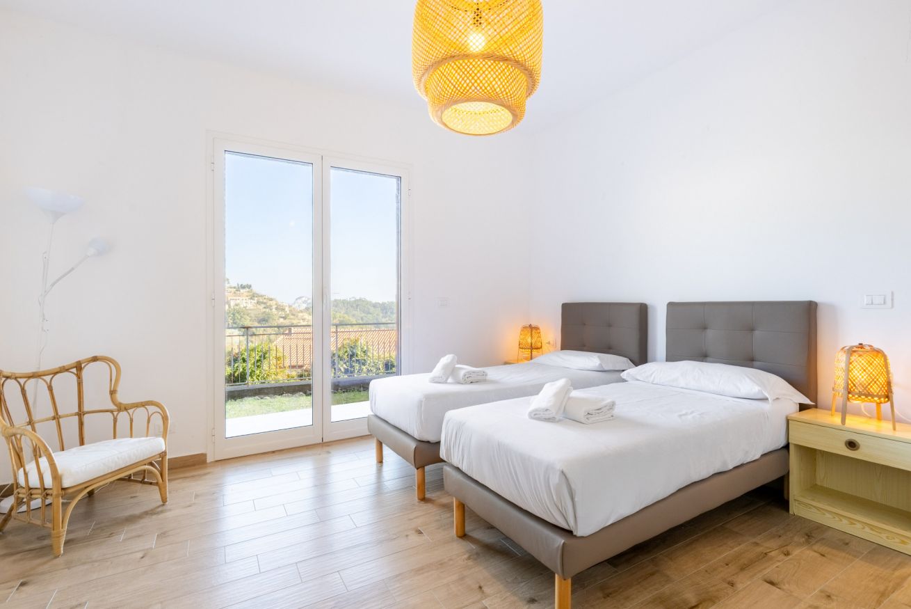 Le camere si affacciano sul patio esterno, creando un piacevole collegamento con gli spazi all’aperto.