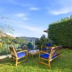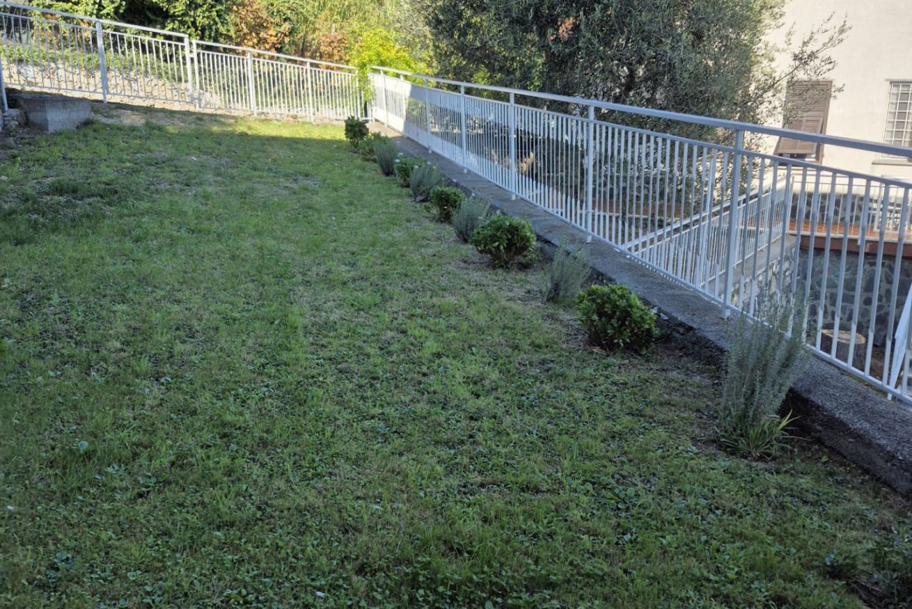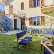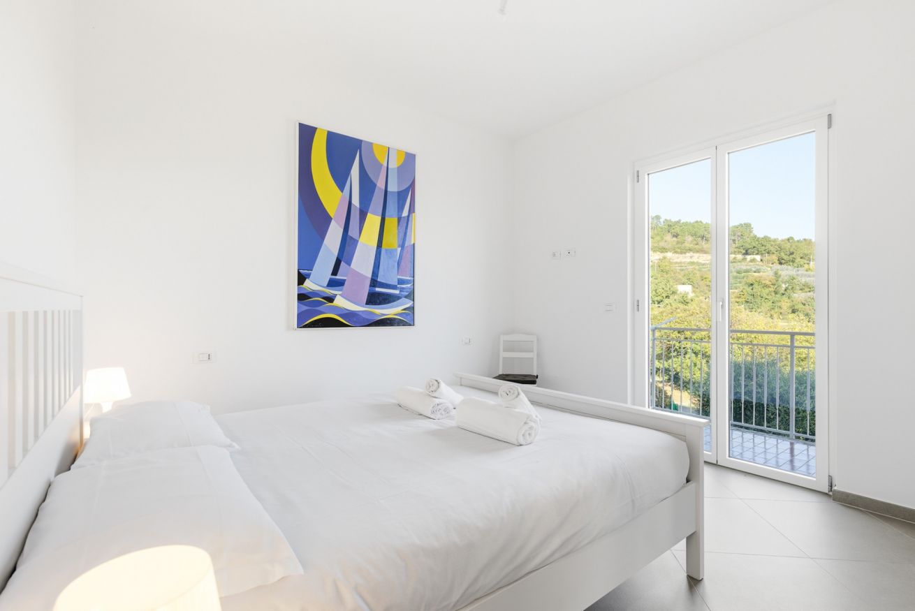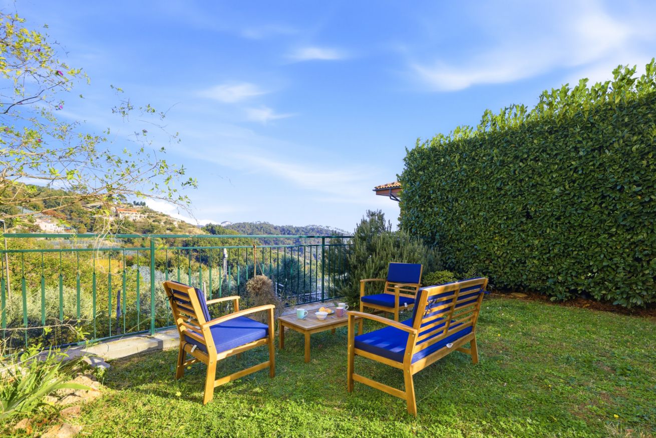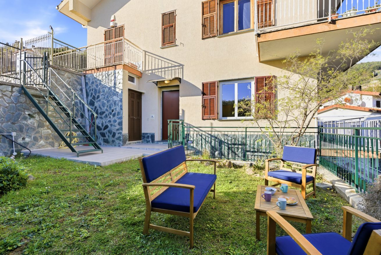 Il soggiorno e una delle camere hanno accesso diretto al giardino privato, con suggestiva vista su montagna e mare.