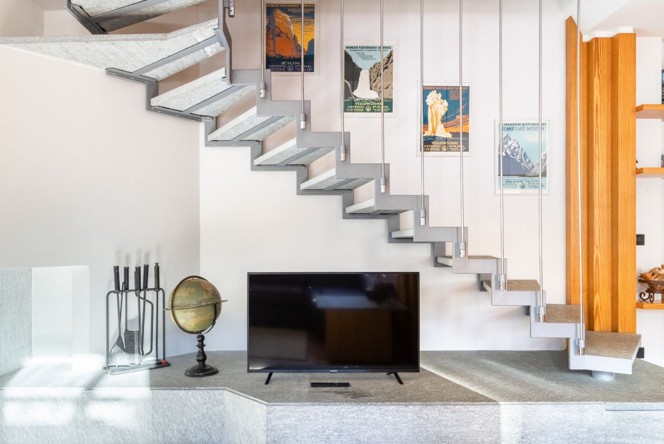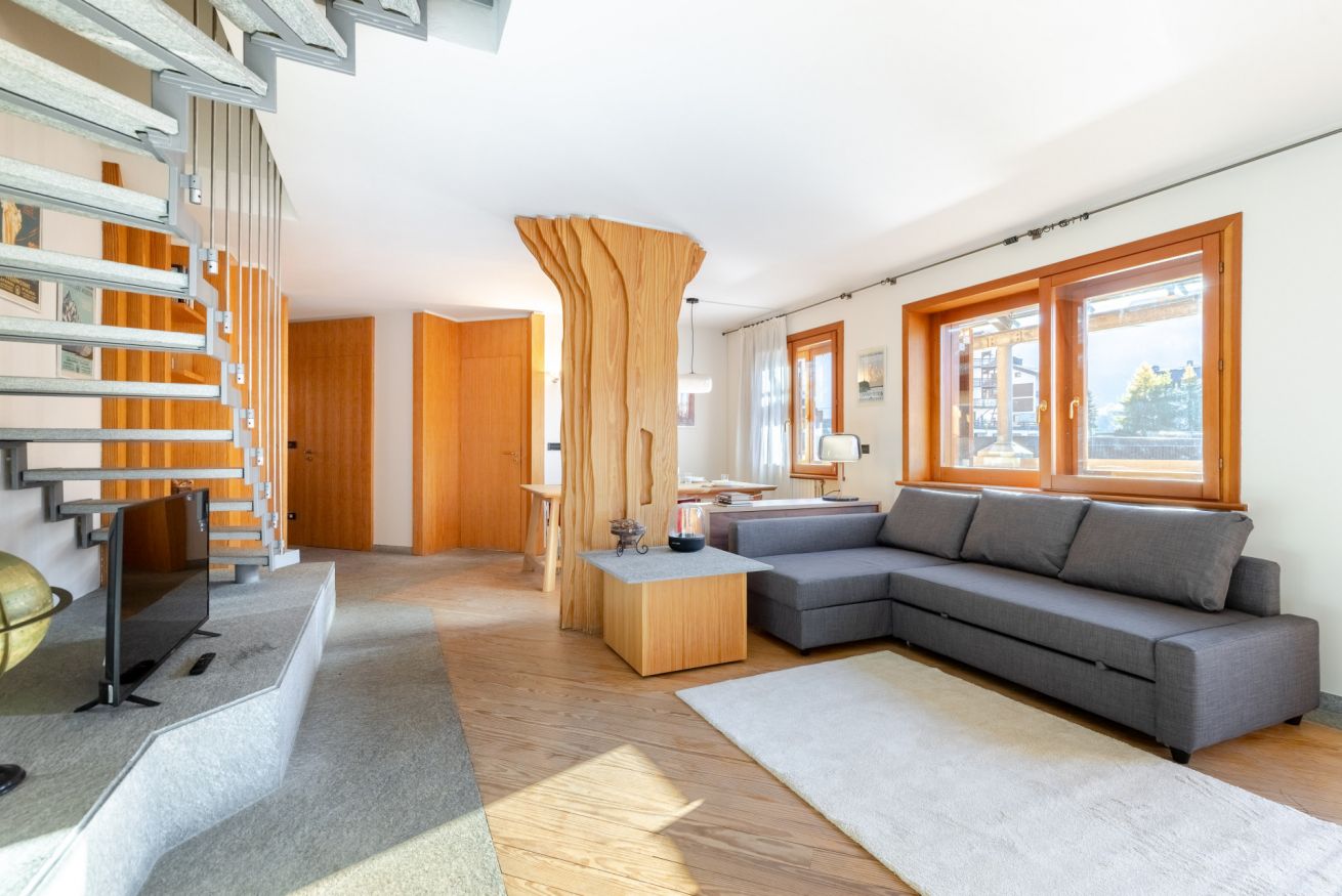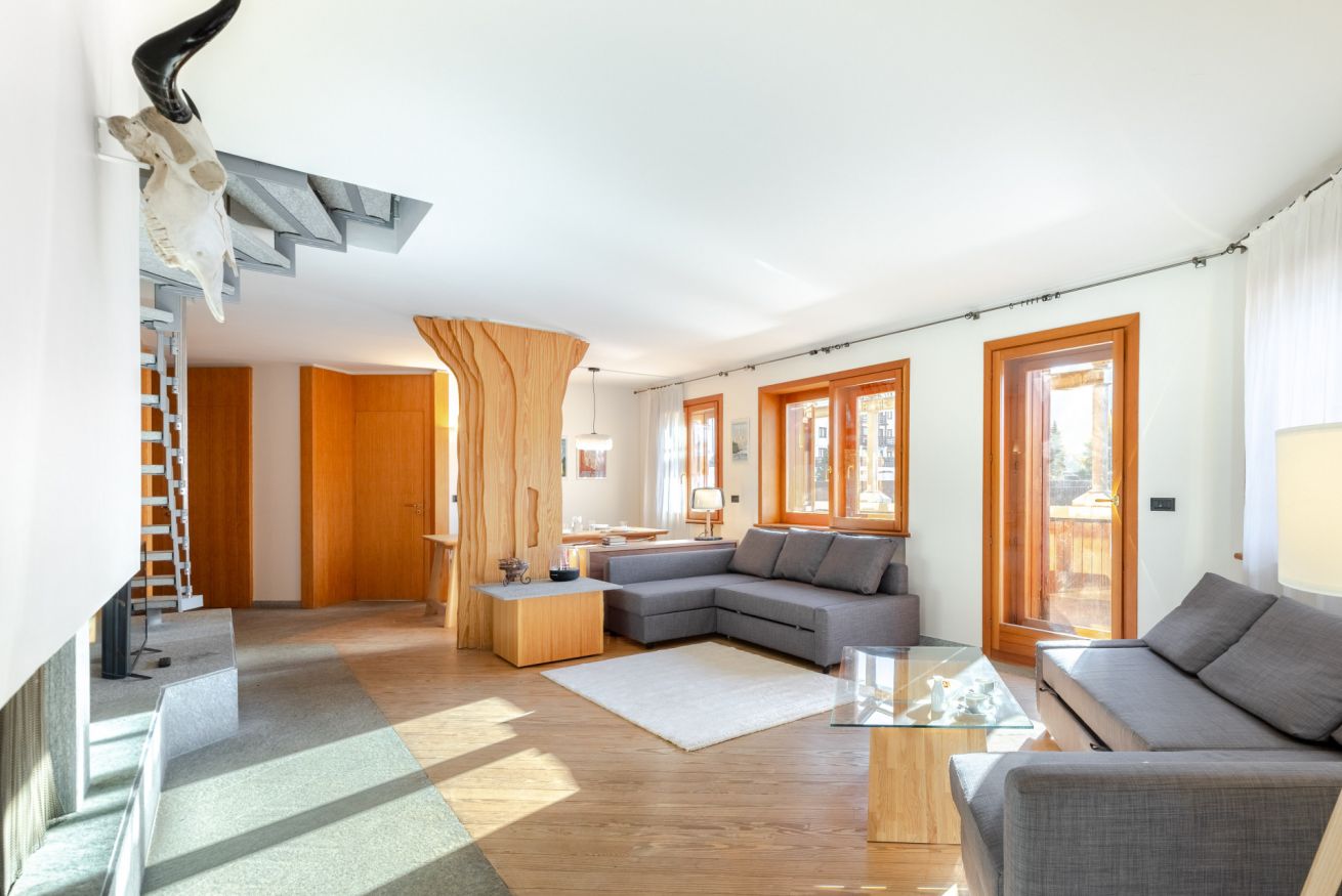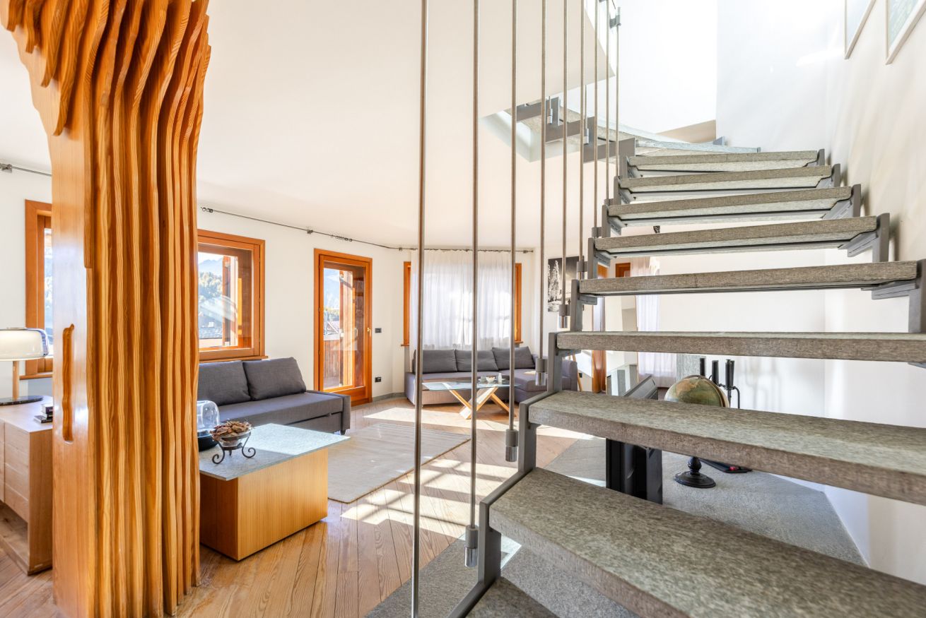 Al piano inferiore vi accoglie un’ampia zona living con 2 divani letto, cucina attrezzata, bagno e un terrazzo di oltre 100 m², dal quale potrete ammirare una vista eccezionale e, per chi non pratica lo sci, godere del sole per tutta la giornata in totale riservatezza.