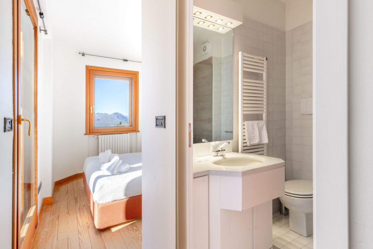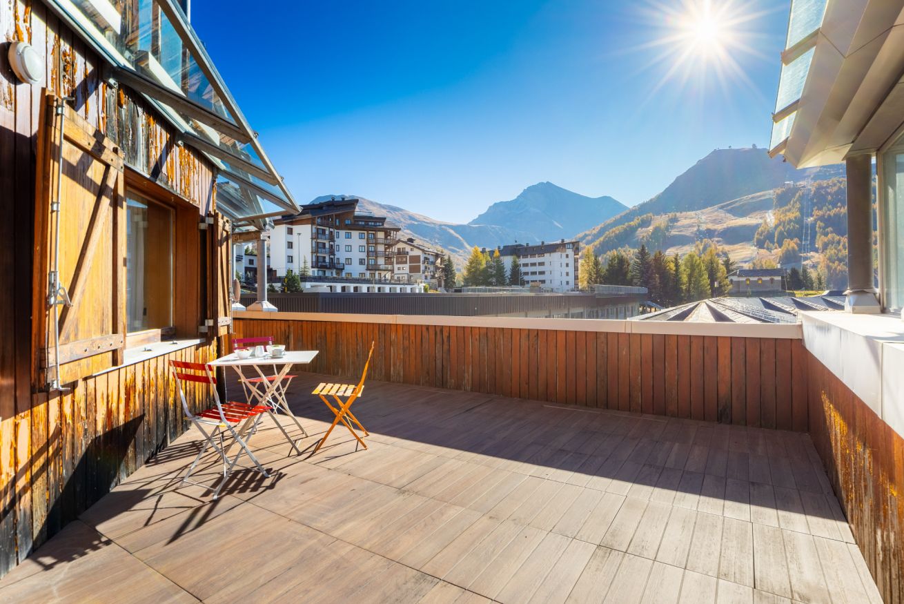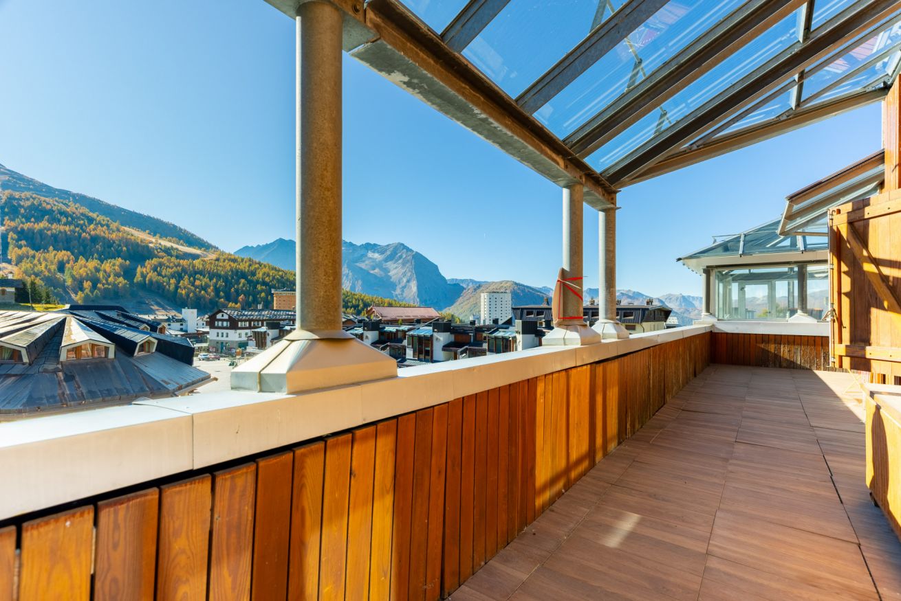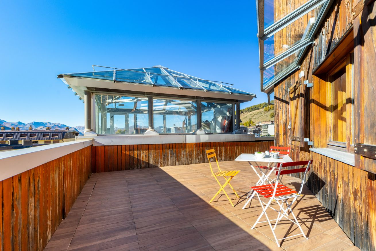 Al piano inferiore vi accoglie un’ampia zona living con 2 divani letto, cucina attrezzata, bagno e un terrazzo di oltre 100 m², dal quale potrete ammirare una vista eccezionale e, per chi non pratica lo sci, godere del sole per tutta la giornata in totale riservatezza.
